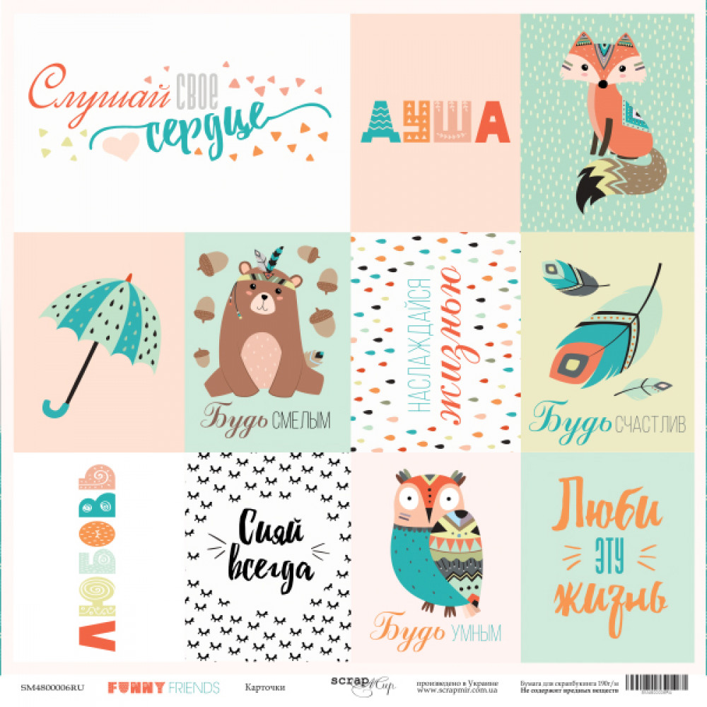 Лист одностороннього паперу 30x30 від Scrapmir з колекції Funny Friends 1шт.